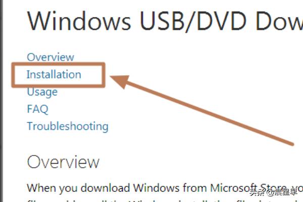 1、去搜索一下Windows USB/DVD Download Tool,选择进入微软官方网站下载。进入后如图点击Installtion。