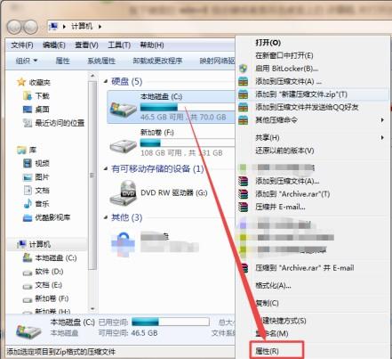 打开之后,根据需要选择要修复的磁盘,如C盘,然后鼠标右击,在出现的菜单中点击 属性 选项。