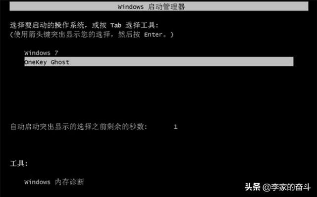 5.这时候电脑重启,开机启动项多出Onekey Ghost,默认自动选择Onekey Ghost进入安装过程。