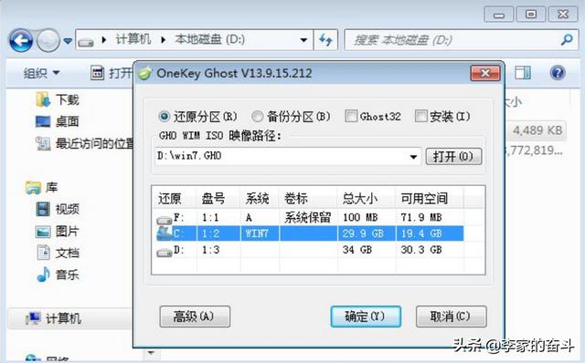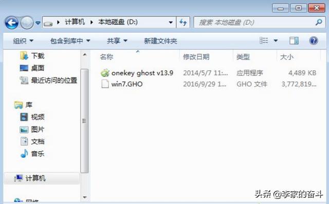 2.将win7.gho文件和Onekey ghost工具放到同一目录,比如D盘,不要放C盘或桌面。
