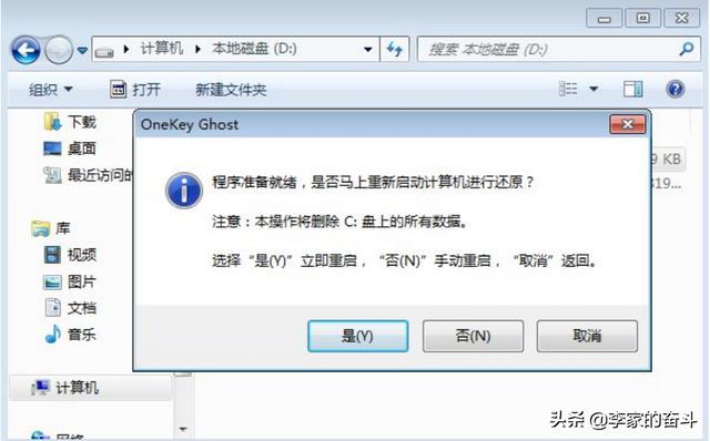 4.弹出提示框,确认没有重要数据之后,点击是,立即重启进行计算机还原,也就是重装系统过程。