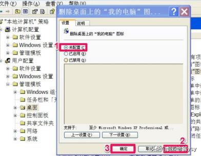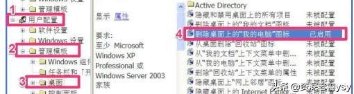2,进入组策略窗口后,按此“用户配置”->“管理模板”->“桌面”路径,找到右铡的“删除桌面上我的电脑图标”这一项,双击。