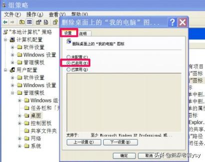 3,进入此项的属性窗口后,选择“设置”项,其当前的状态是“已启动”,其意思是启动删除“我的电脑”功能,这个启动了,当然桌面上就不会显示图标了。