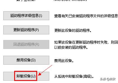 5进入属性界面,点击驱动程序选项卡,然后选择卸载设备,如下图所示