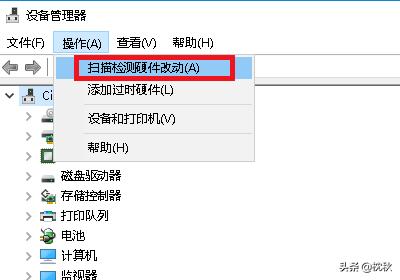 7卸载完成后,点击上方菜单的v操作--扫描硬件改动,如下图所示