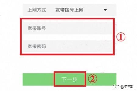4、上网方式默认选择“宽带拨号上网”,输入宽带账户和宽带密码(从网络运营商处获取),点击“下一步”;