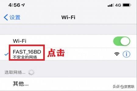 2、打开手机无线网络,找到名称为FAST-XXXX的无线网点击连接,或者手动输入: falogin.cn,进入设置界面;
