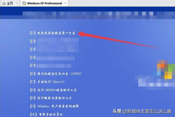 14、来到操作页面点击第一项,将系统装到硬盘第一分区。