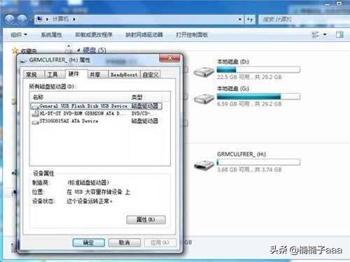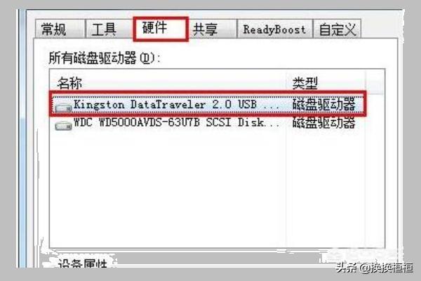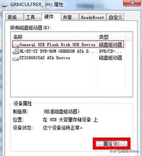 4、在U盘盘符上鼠标右键“属性”,然后选择“硬件”选项卡。