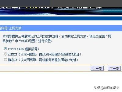 5、点击下一步,进入上网方式设置,我们可以看到有三种上网方式的选择,如果你家是拨号的话那么就用PPPoE。动态IP一般电脑直接插上网络就可以用的,上层有DHCP服务器的。静态IP一般是专线什么的,也可能是小区带宽等,上层没有DHCP服务器的,或想要固定IP的。因为我拨号所以选择pppoe。