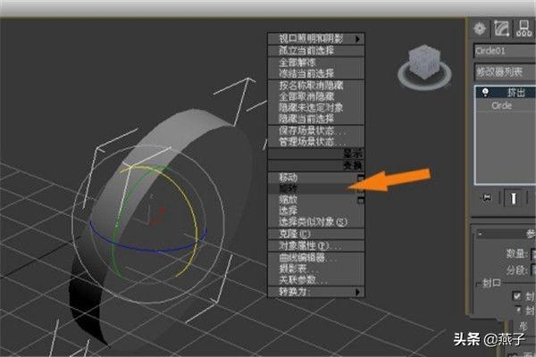 9. 通过旋转方式,把立体圆形立起来,摆正。 然后,选择立体圆形,右键菜单选择旋转,通过旋转方式,把立体圆形立起来,摆正,如下图所示。