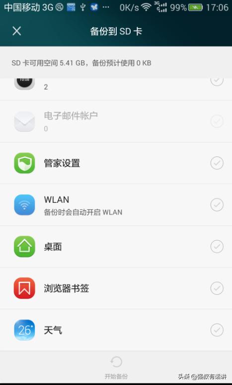 4,下拉滚动,找到wlan选项,连接过的wifi密码就是保在这个的!!勾选wlan,开始备份!